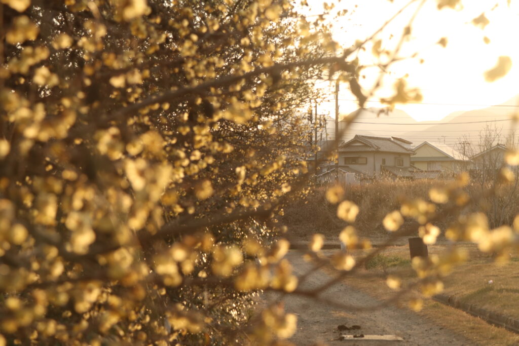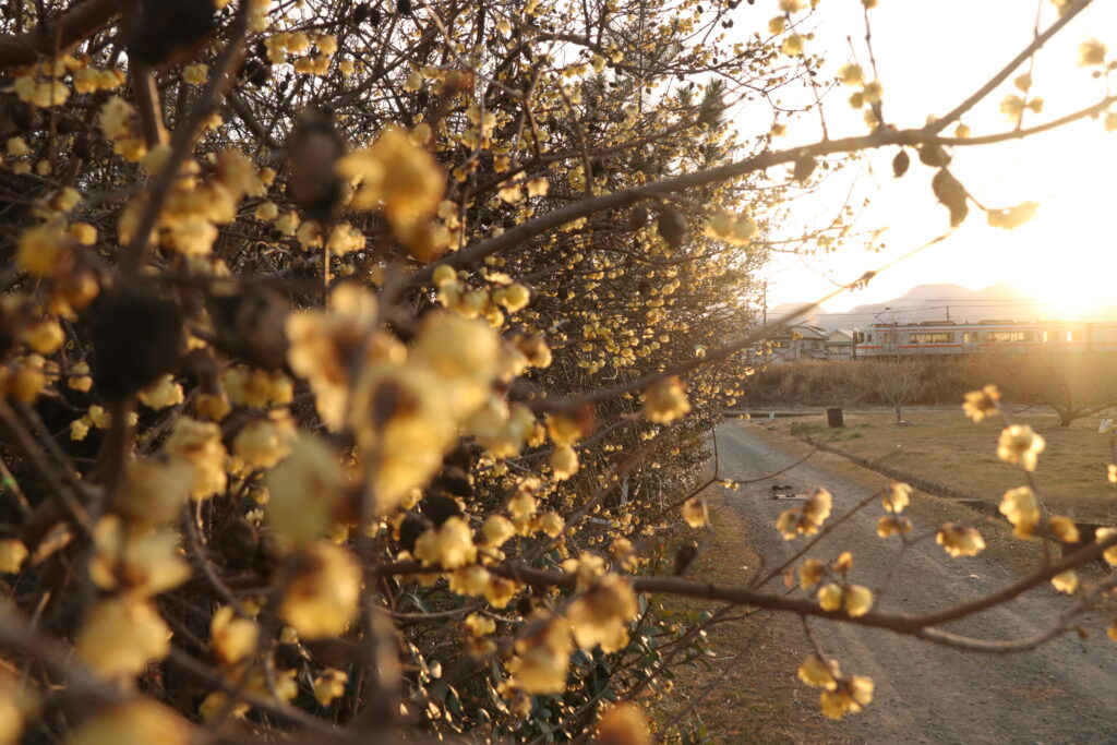 逆光を活かしてロウバイの色をいい感じに出せたのはよかったけど、電車をどの位置にするかかなり迷った。